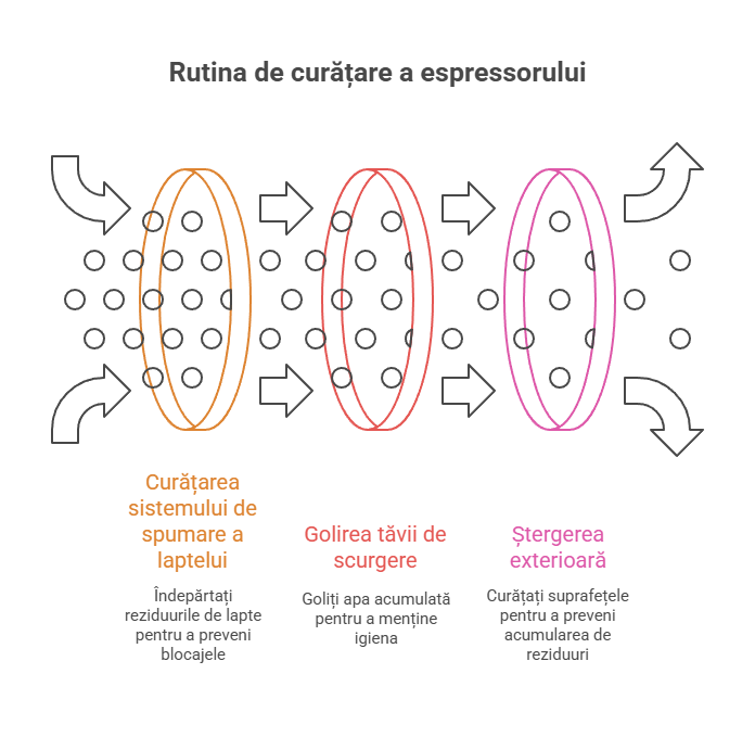 Care este rutina zilnică recomandată: sistemul de spumare a laptelui, tava de scurgere și suprafețele exterioare