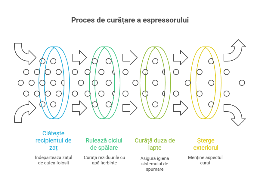 🔹 Curăță duza de lapte (dacă aparatul are sistem de spumare).